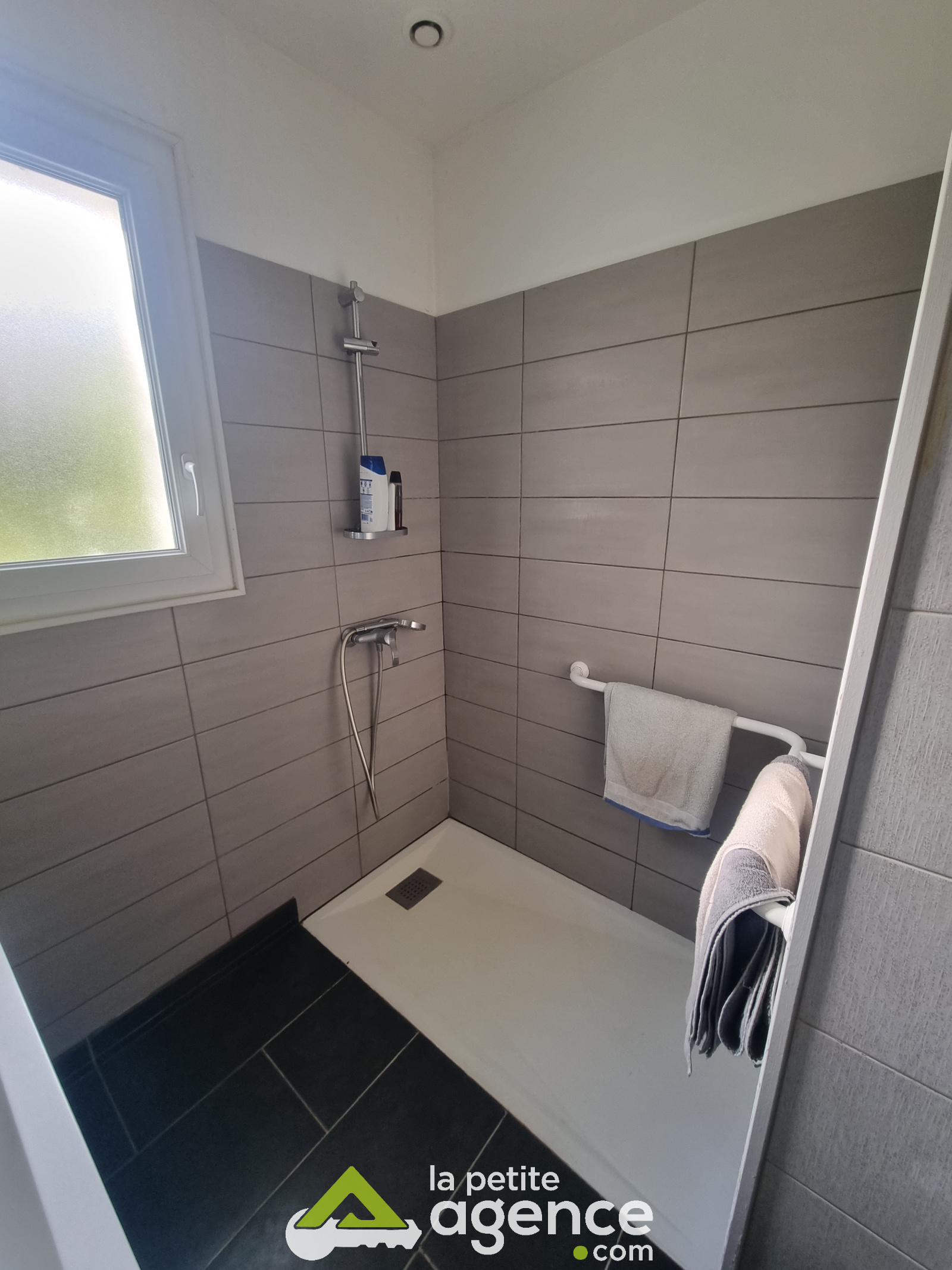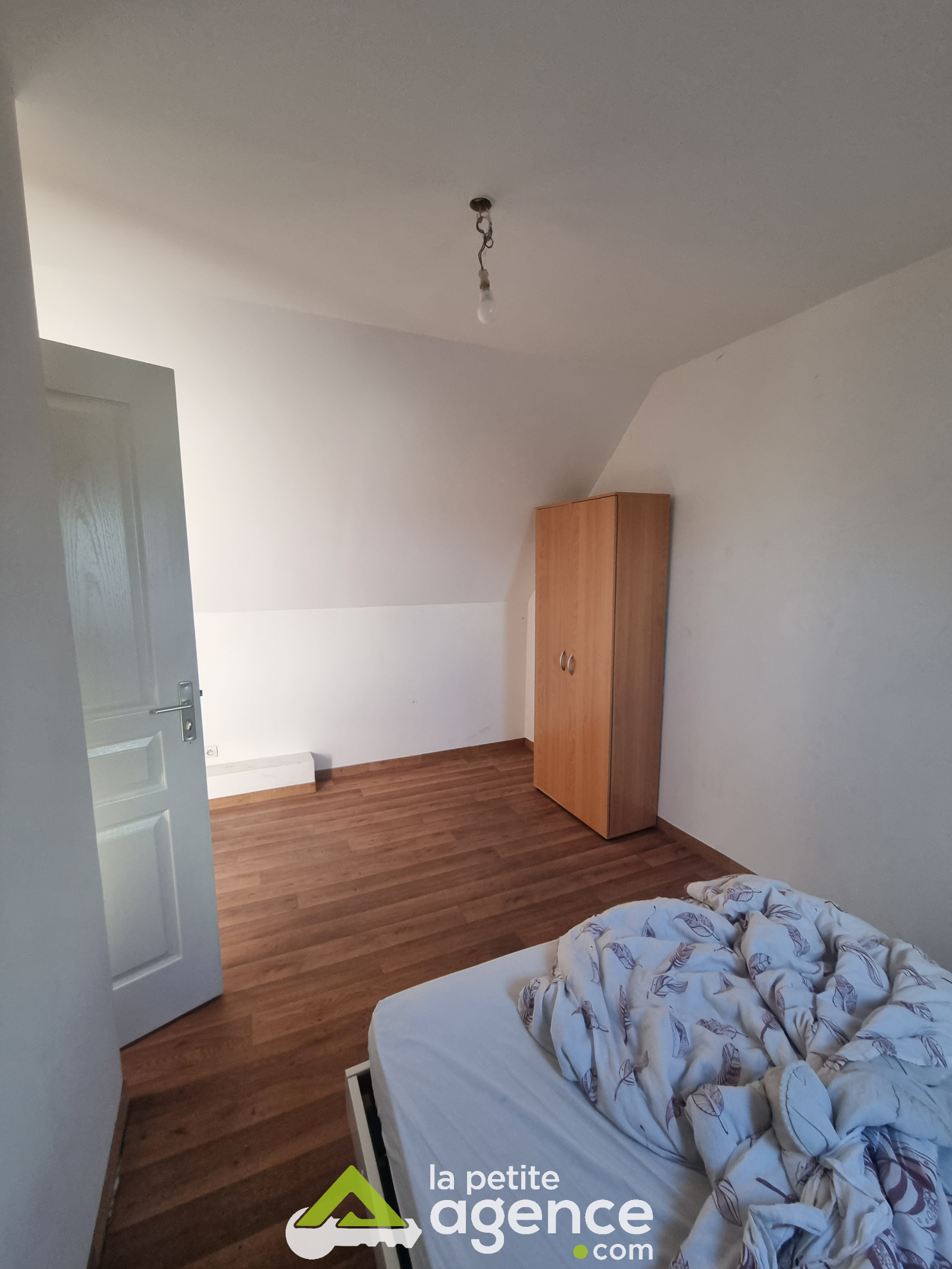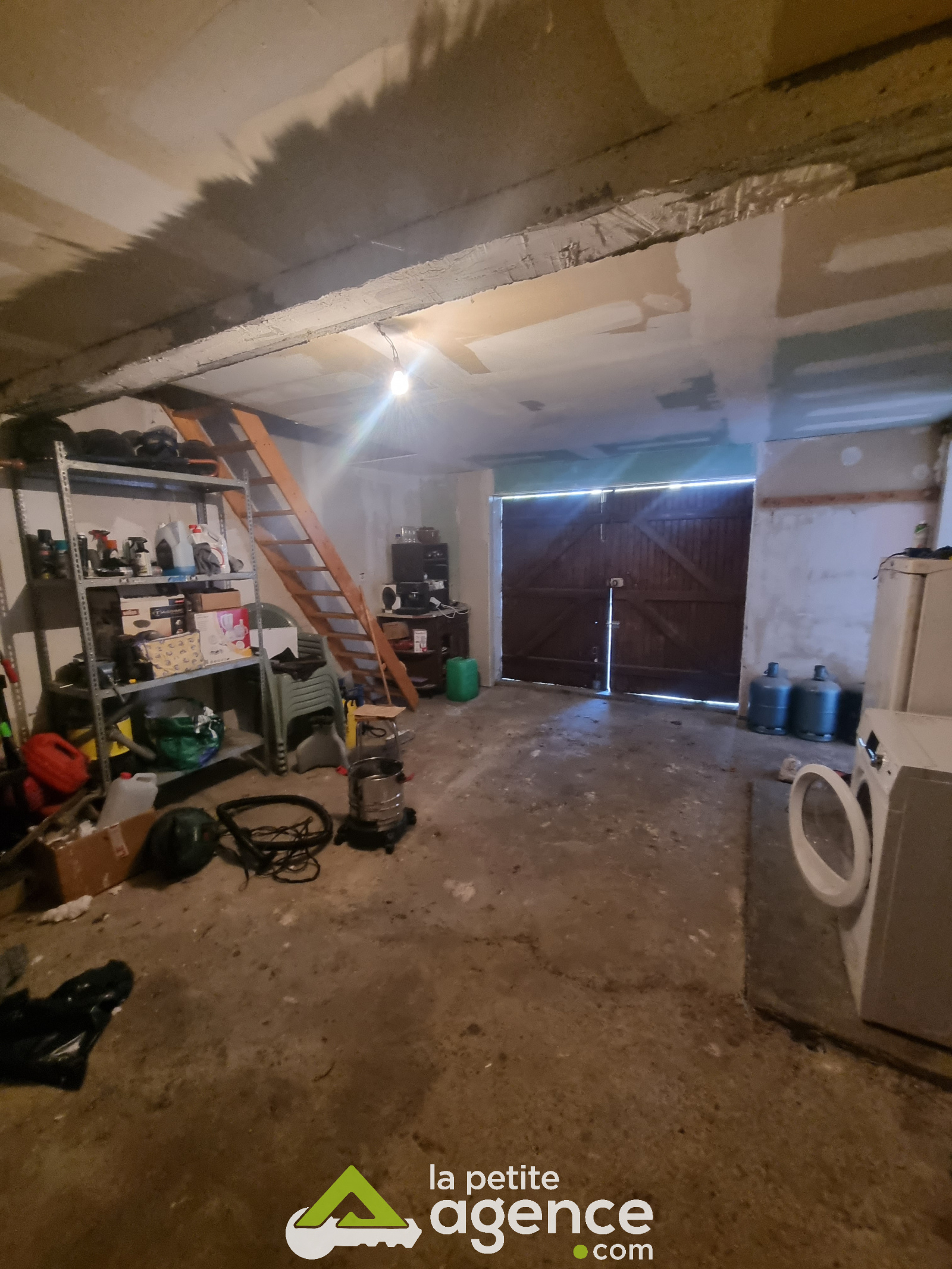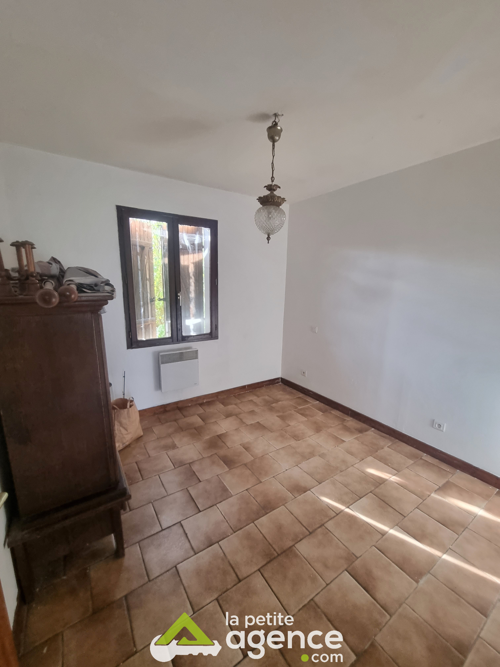 D'une entrée sur salon/séjour avec un insert à bois, de deux chambres, d'une salle de douche, un WC, ainsi qu'une cuisine et d'une buanderie.