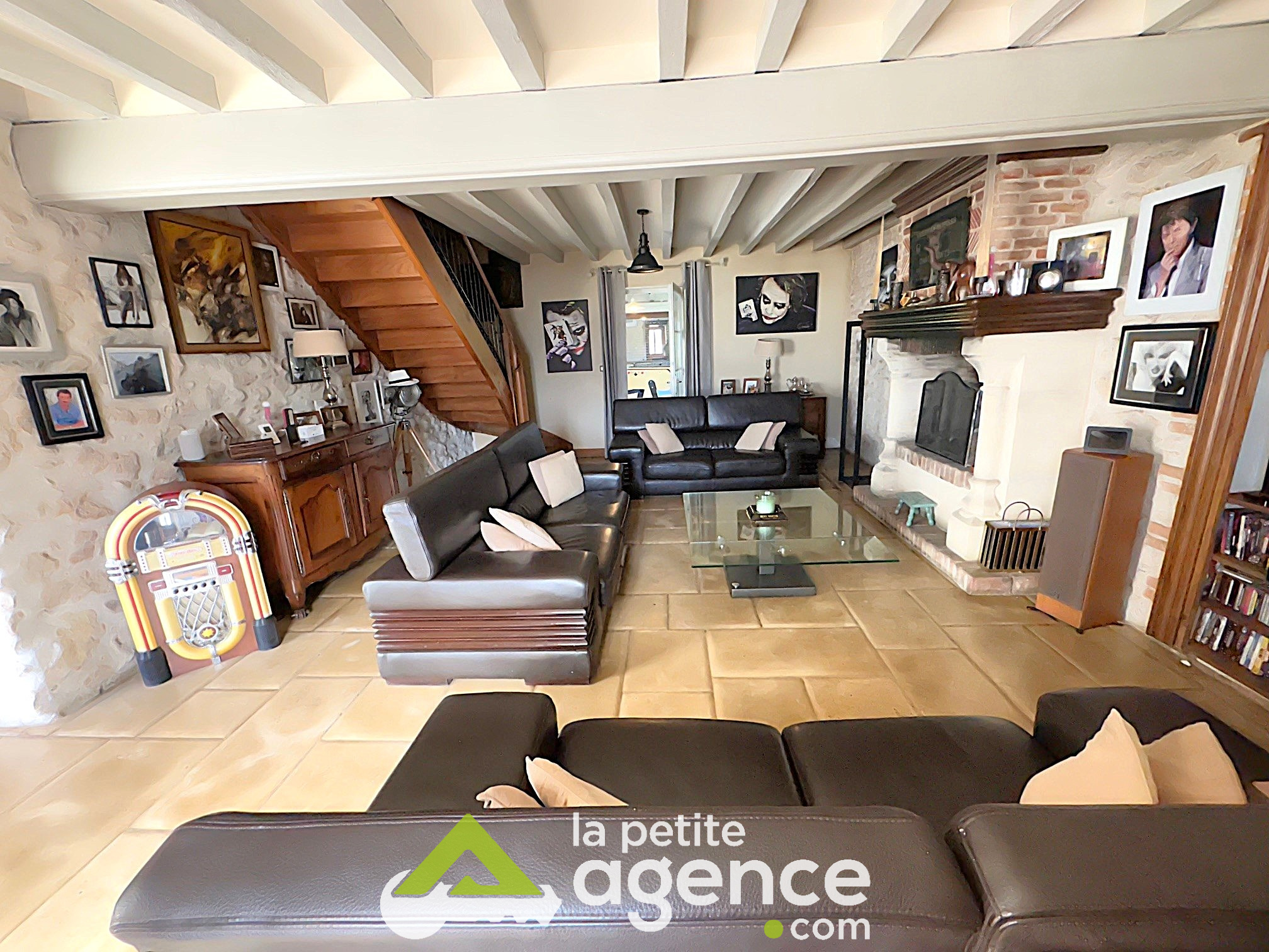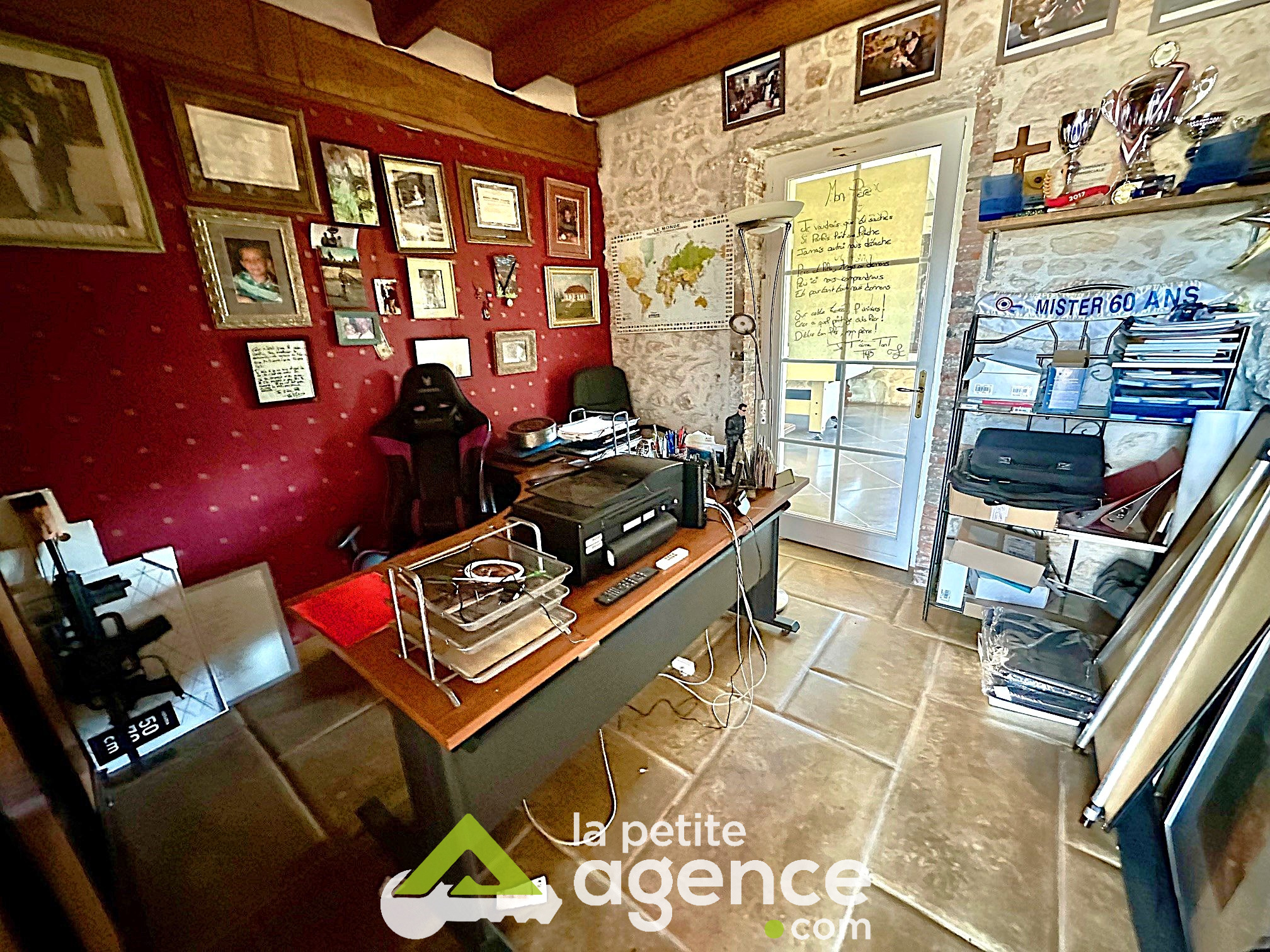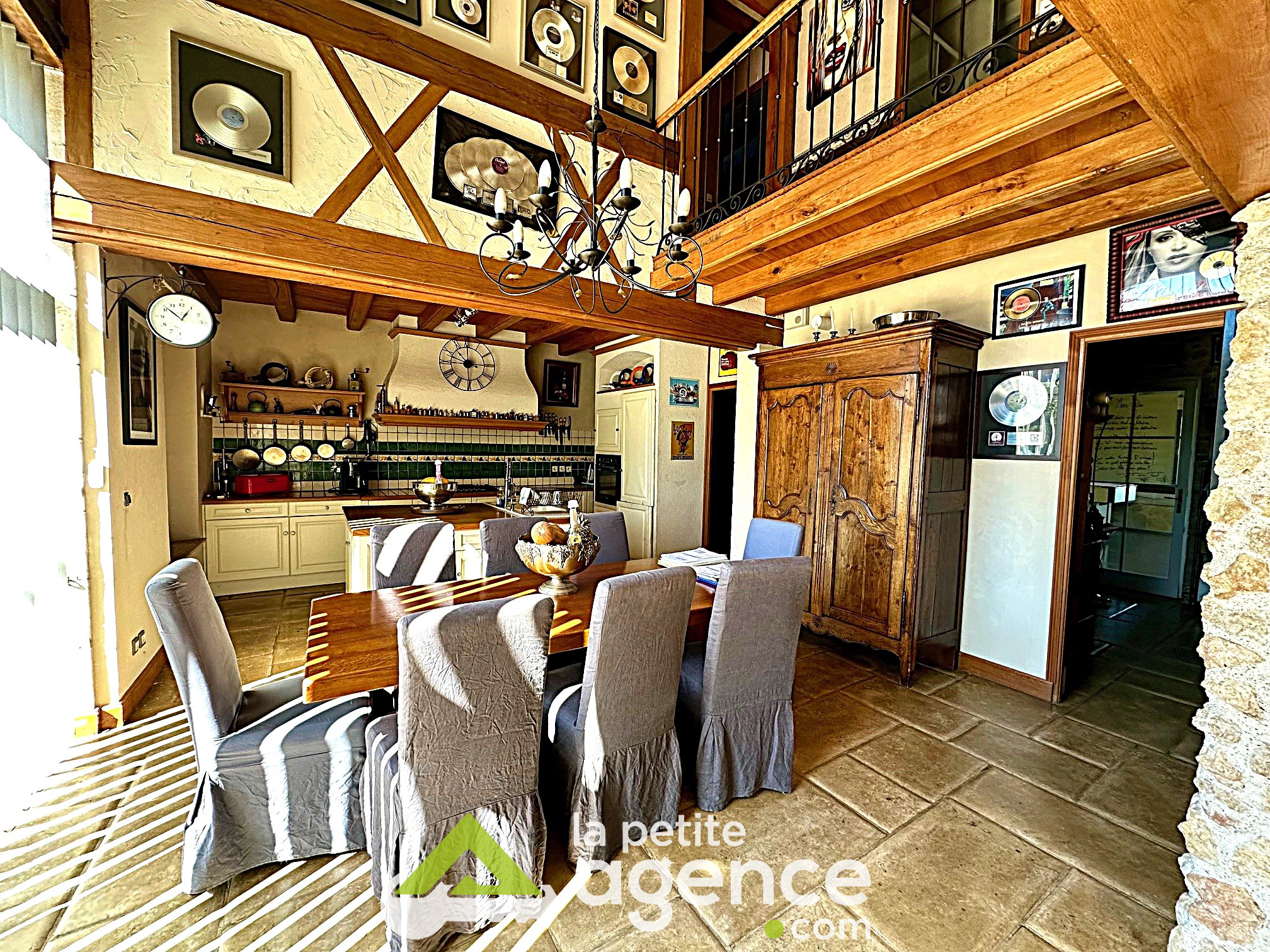 Cette bâtisse se compose au rez de chaussée: d'un grand salon-séjour avec cheminée en pierre, d'une cuisine équipée et aménagée, d'un bureau, d'un cellier d'une grande véranda et des WC.