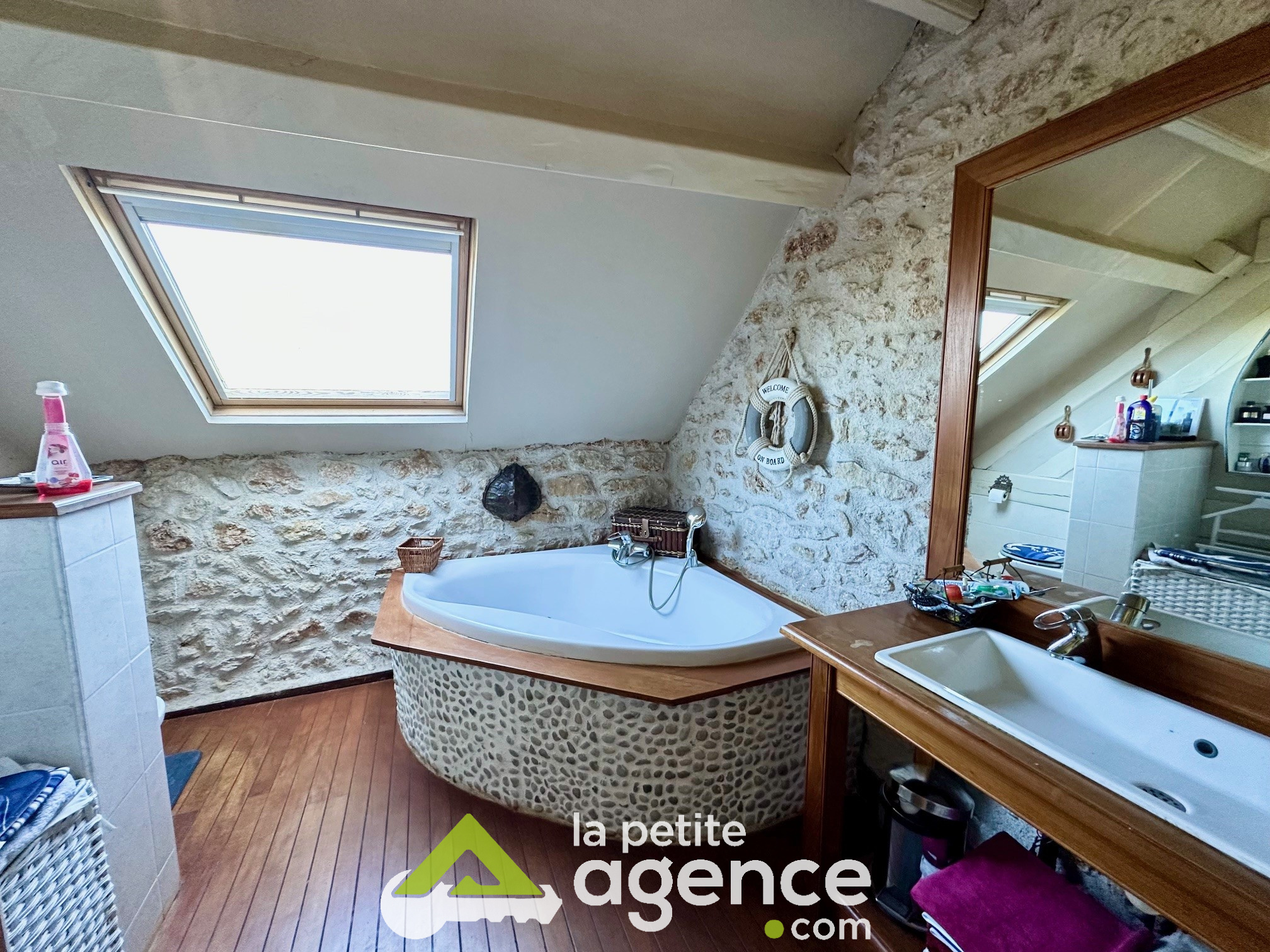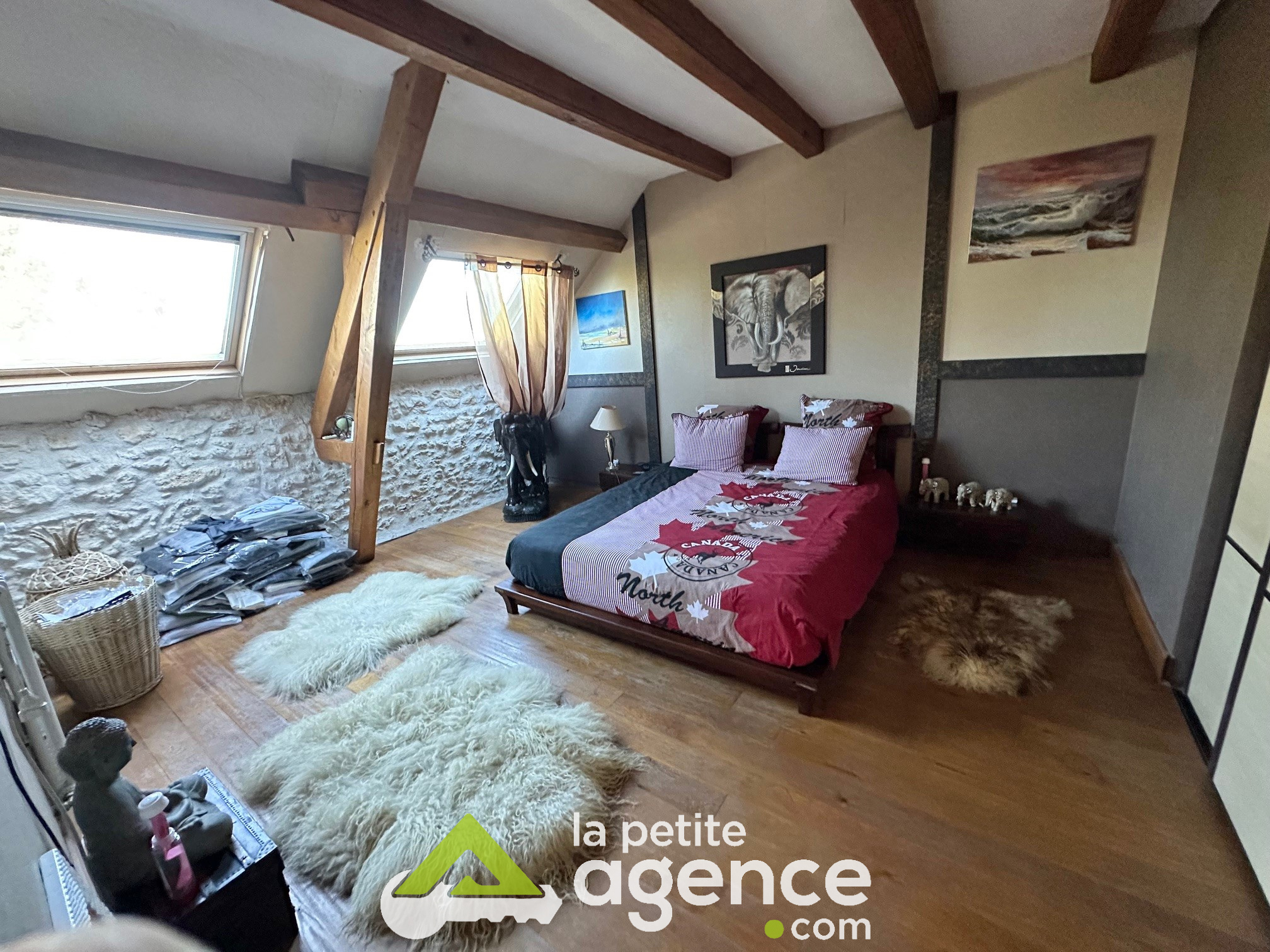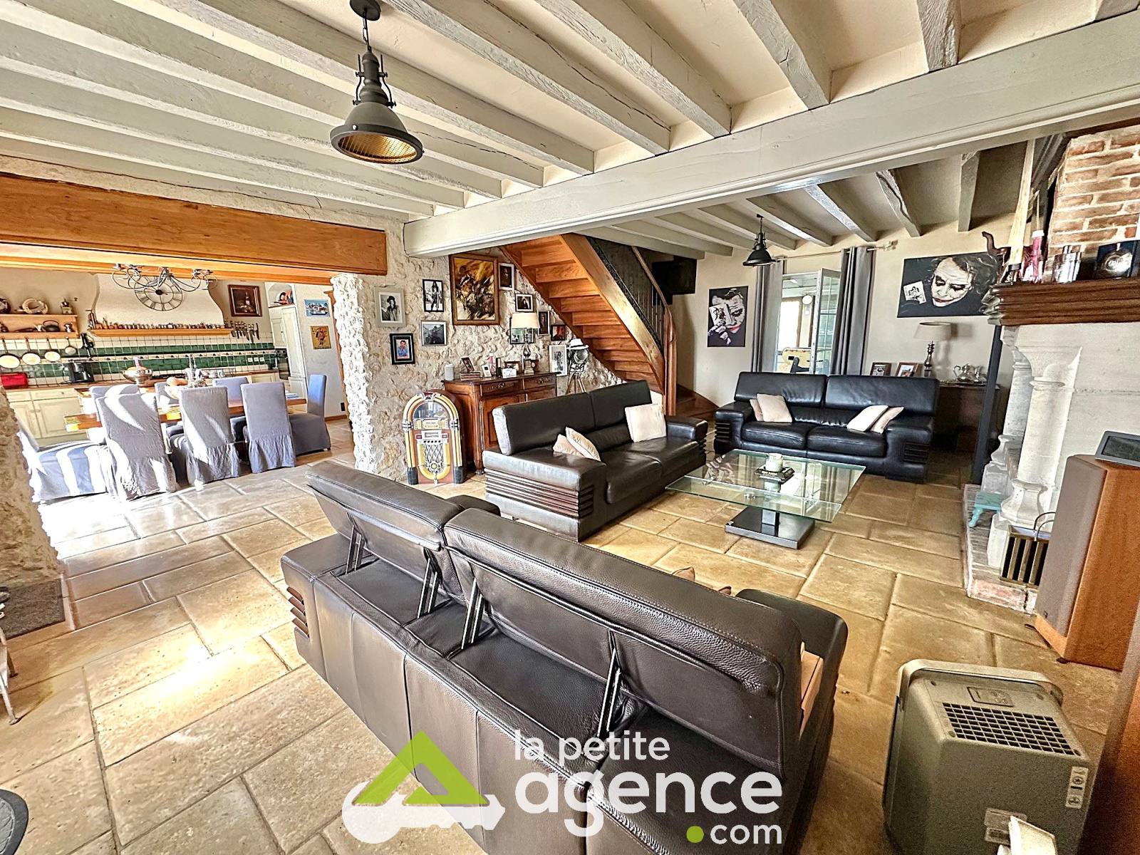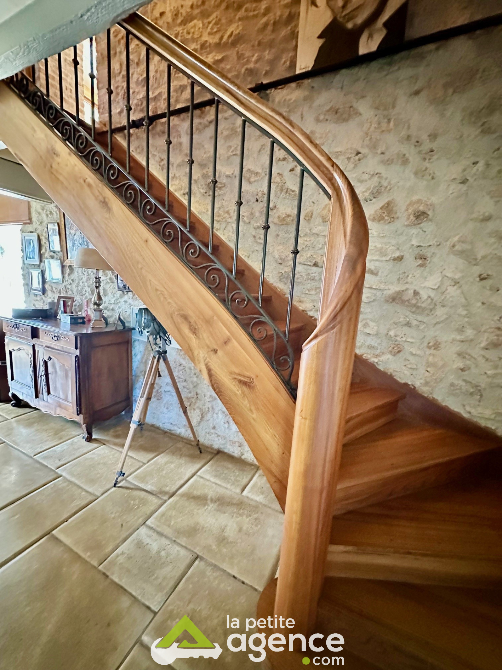 Cette bâtisse se compose au rez de chaussée: d'un grand salon-séjour avec cheminée en pierre, d'une cuisine équipée et aménagée, d'un bureau, d'un cellier d'une grande véranda et des WC.