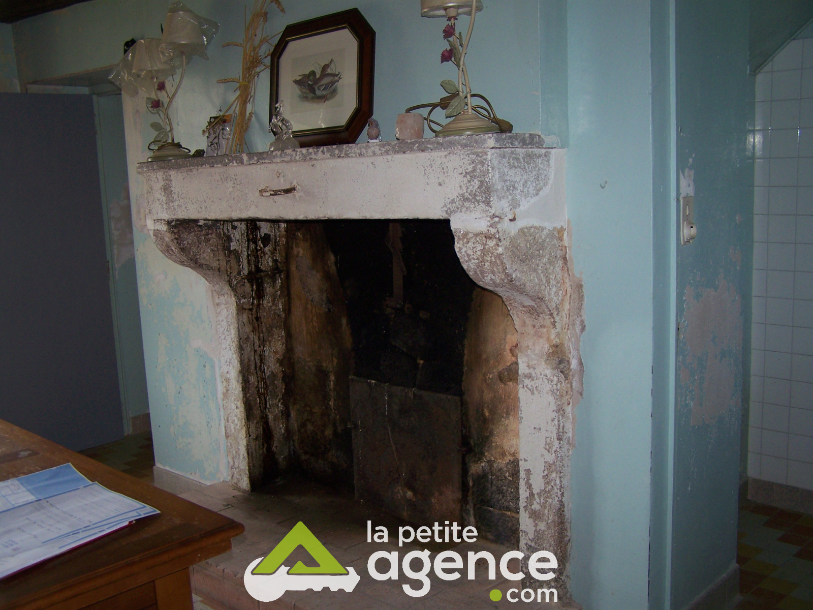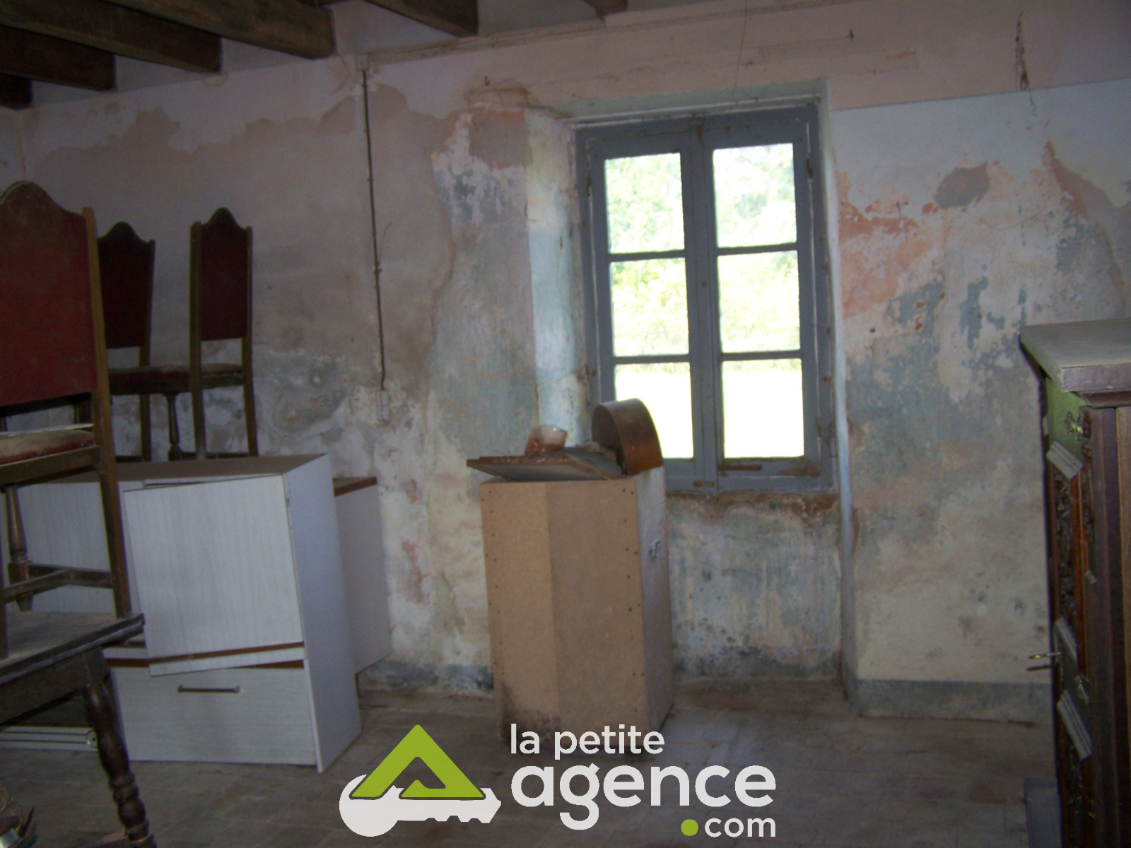 Entrée par couloir de 5 m²- Pièce de vie avec coin cuisine /évier et cheminée ( poutres et carrelage) de 27m²